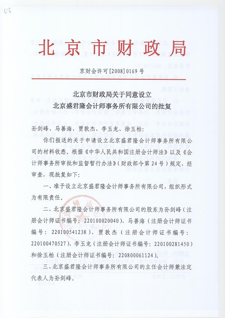 北京市财政局关于同意设立北京盛君隆会计师事务所有限公司的批复