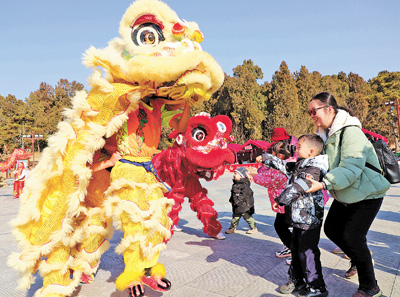 河南南阳卧龙岗文化园内,市民在欣赏舞狮表演。 |